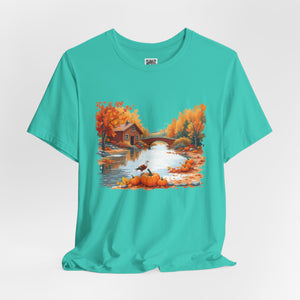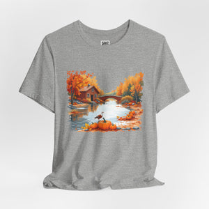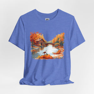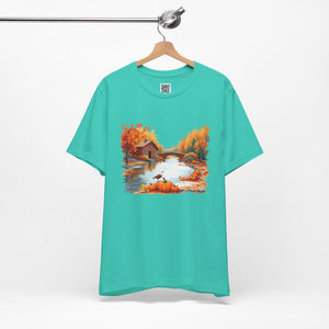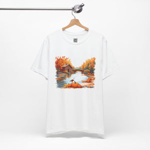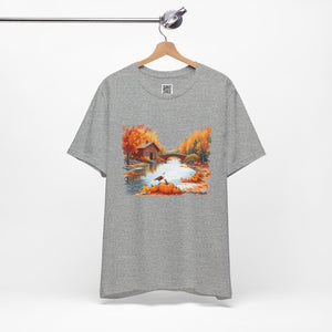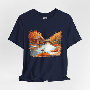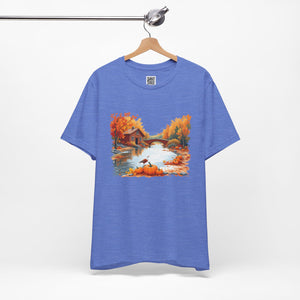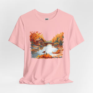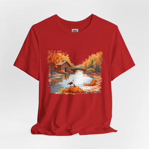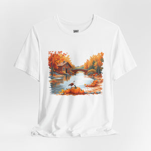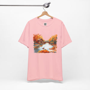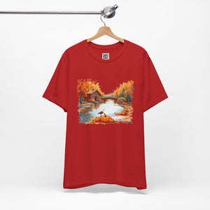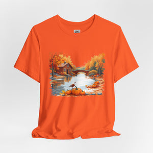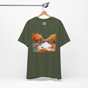 Embrace the heartwarming charm of fall with this stunning “Autumn by the River” design. Set against a backdrop of golden-orange foliage, a quaint red cabin rests peacefully beside a reflective river. Pumpkins are scattered along the banks, while a graceful bird perches beside them, soaking in the crisp seasonal air. A rustic wooden bridge completes the peaceful countryside scene, a perfect celebration of autumn’s beauty.