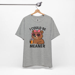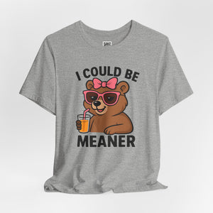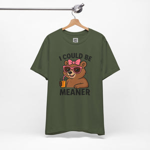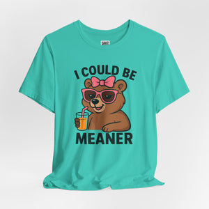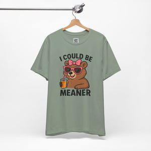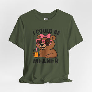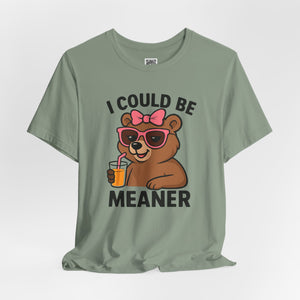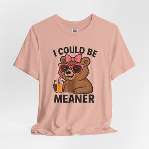 This cheeky bear is living proof that sass can be served with style. Wearing oversized pink sunglasses and a matching bow, she casually sips her juice with the sly smirk of someone who’s holding back—barely. The phrase “I Could Be Meaner” completes the attitude-packed look, perfect for those who embrace their sweet side… with limits.