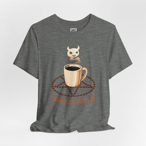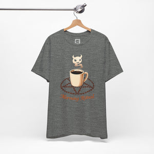 Start your day with a brew that's both bold and a little bit wicked. This eye-catching design features a steaming coffee cup placed atop a pentagram made entirely of coffee beans. Rising from the cup is a swirl of steam that forms a playful devil face—because caffeine is a little dark magic, right?