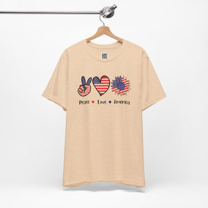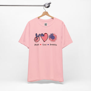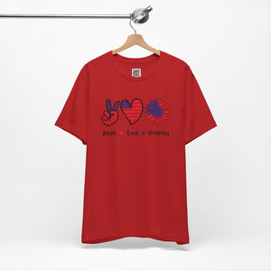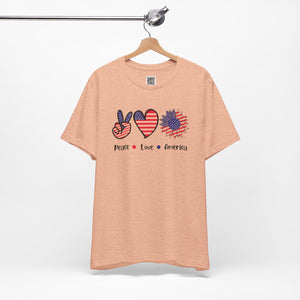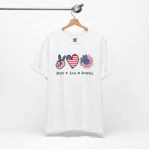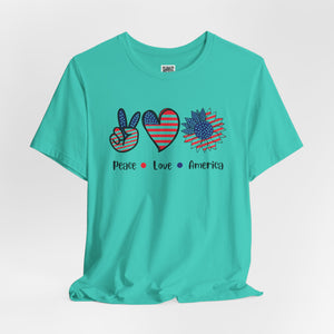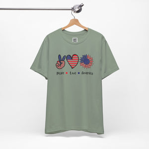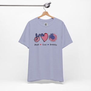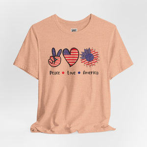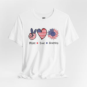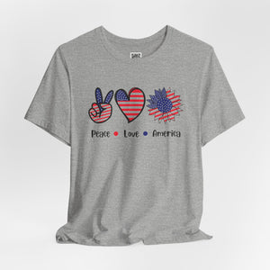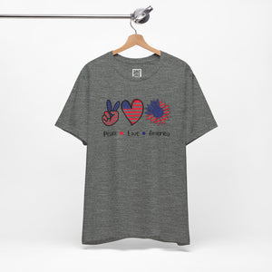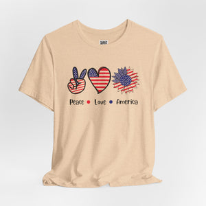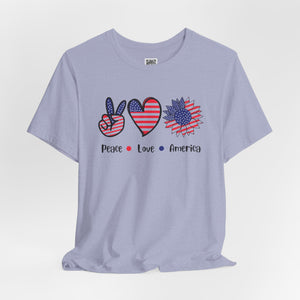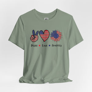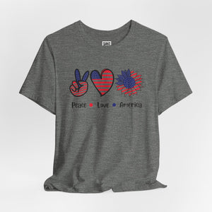 Celebrate freedom in full bloom with this bold and cheerful “Peace, Love & Freedom” design! Featuring a red, white, and blue American flag pattern across a peace sign, heart, and sunflower trio, this artwork blends classic Americana with a fresh, modern vibe. It’s a joyful expression of patriotism, perfect for summer, Independence Day, or everyday wear that honors the red, white, and blue.