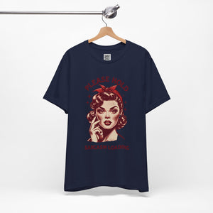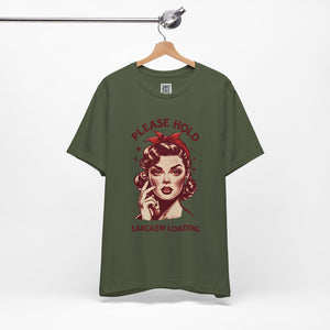 Dial up the sarcasm and the style with this cheeky vintage graphic featuring a fierce 1950s-inspired woman and the hilarious phrase: “Please Hold… Sarcasm Loading.” With bold red tones, elegant curls, and that unmistakable smirk, this design is a tribute to all the quick-witted queens who serve sass before coffee. It’s a must-have for anyone who’s fluent in sarcasm and looks good while delivering it.