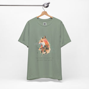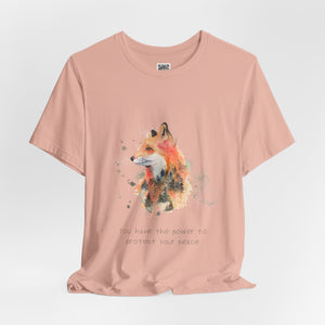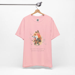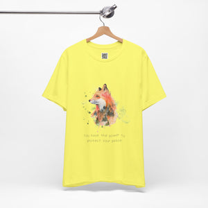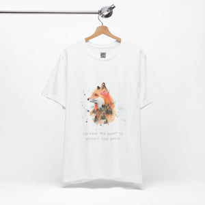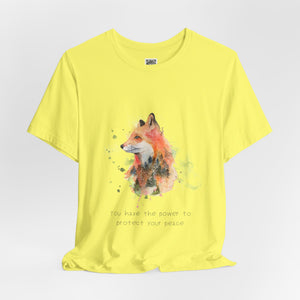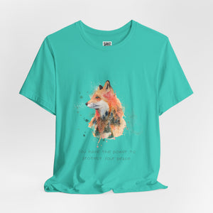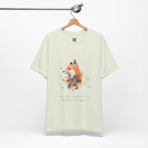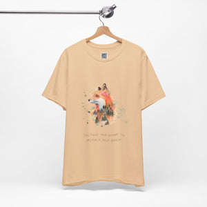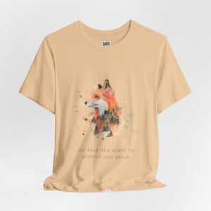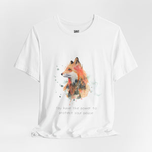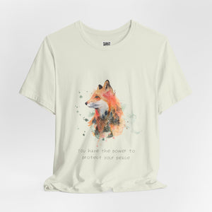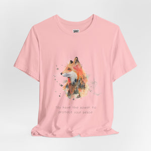 Channel quiet strength and soulful clarity with the Protect Your Peace Tee, featuring a breathtaking watercolor fox surrounded by forest trees, soft paint splashes, and the empowering message: “You have the power to protect your peace.”