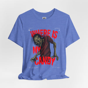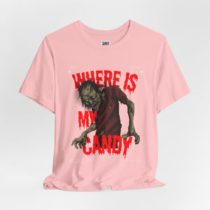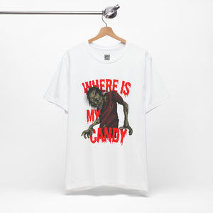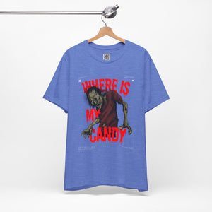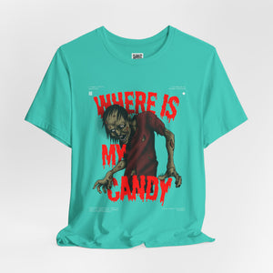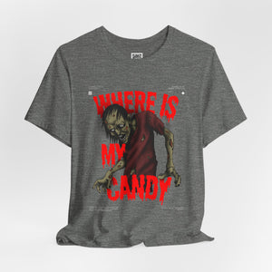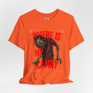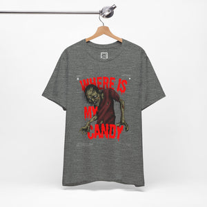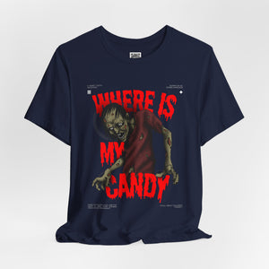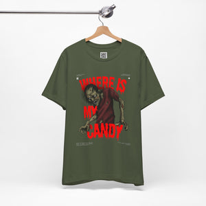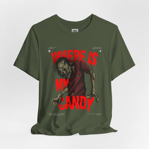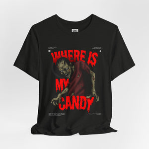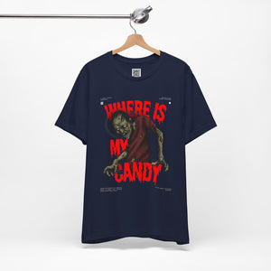 Sink your teeth into the spooky side of sweet cravings with this chilling “Where Is My Candy?” zombie design. Featuring a grotesque, undead creature clawing its way toward its sugary fix, this graphic perfectly captures the Halloween spirit with horror and humor combined. With blood-dripping red text and gritty artwork, it’s a must-have for any candy fiend or Halloween fanatic.
